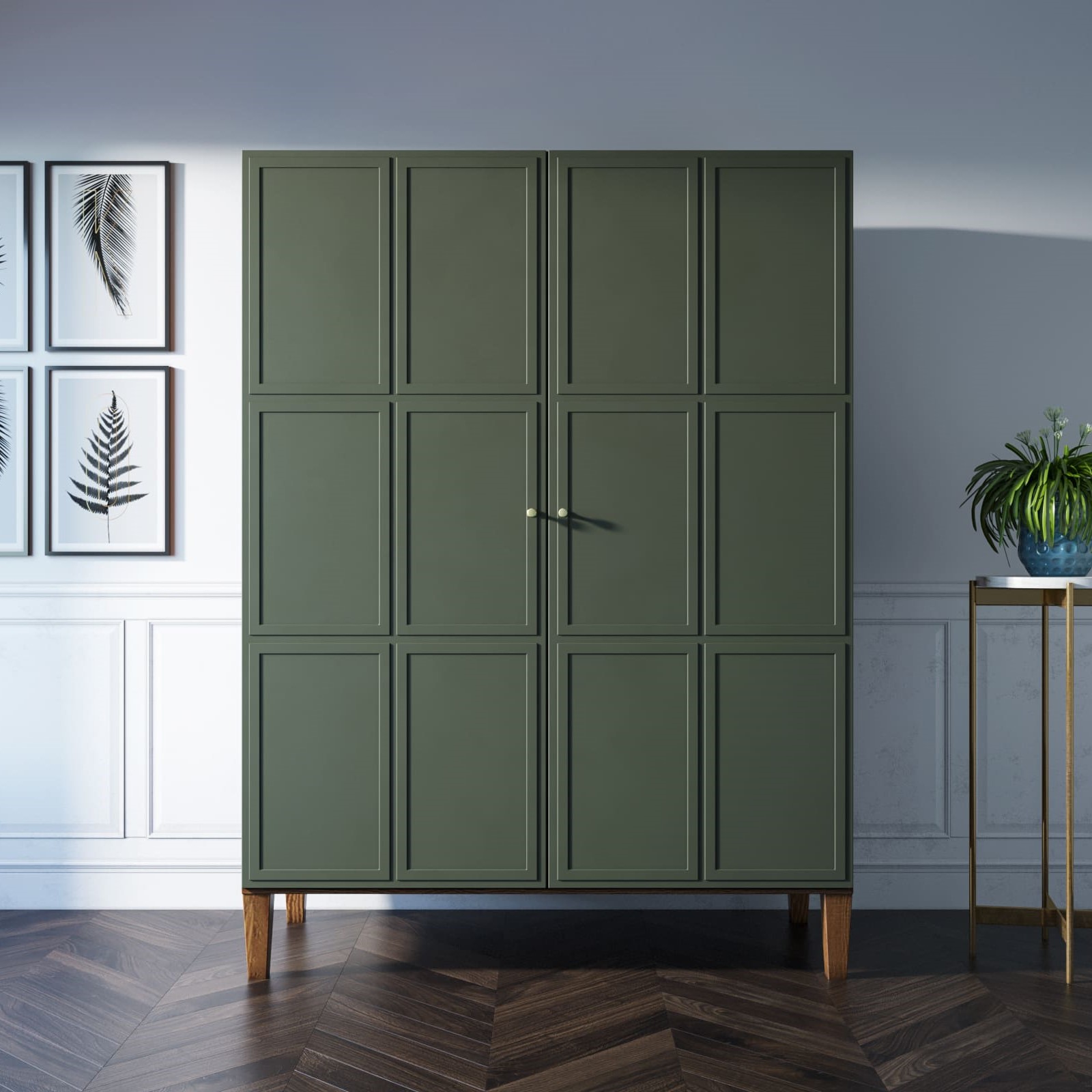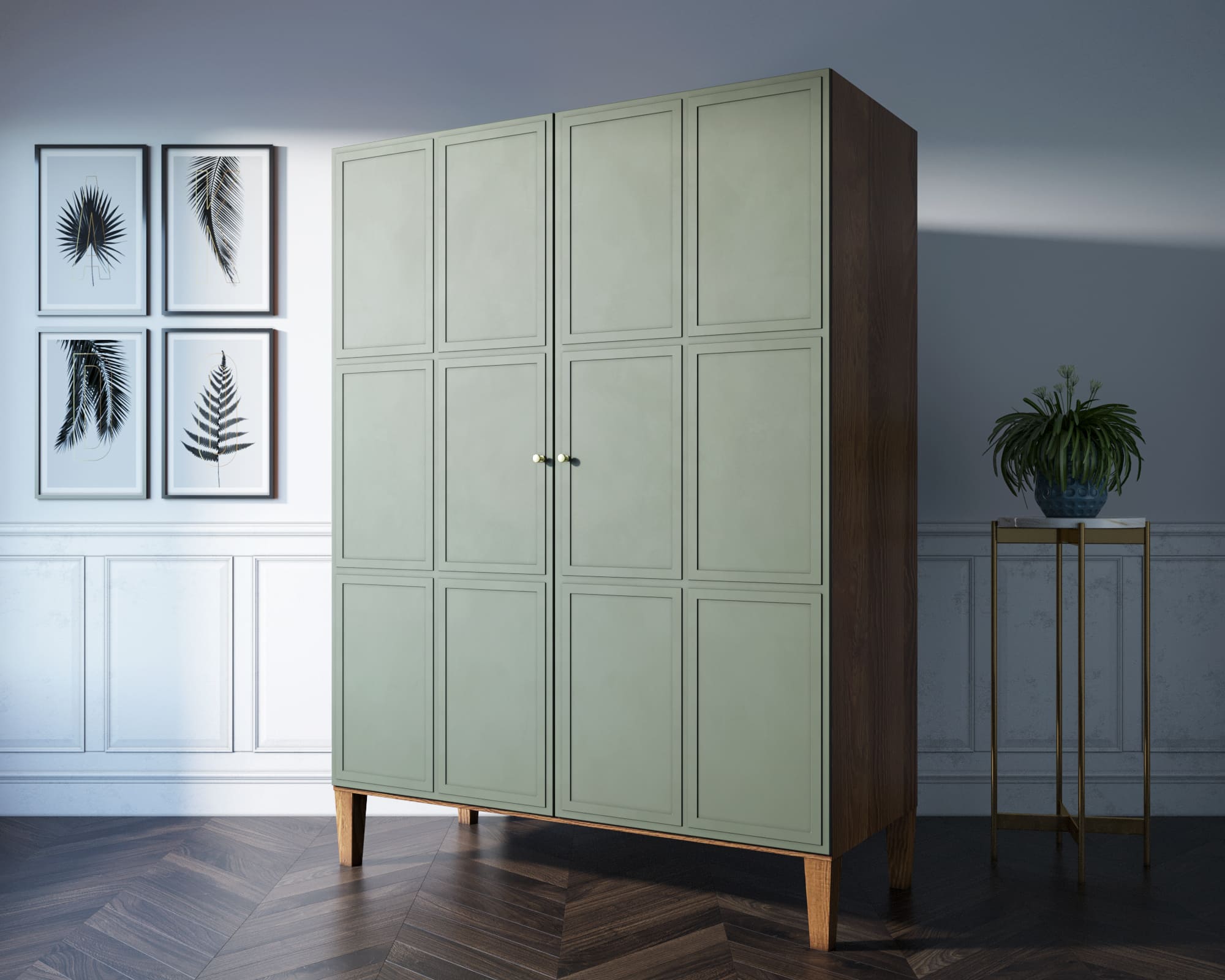 Фасады имеют приятный зеленый оттенок. Корпус шкафа выполнен из шпона ясеня.