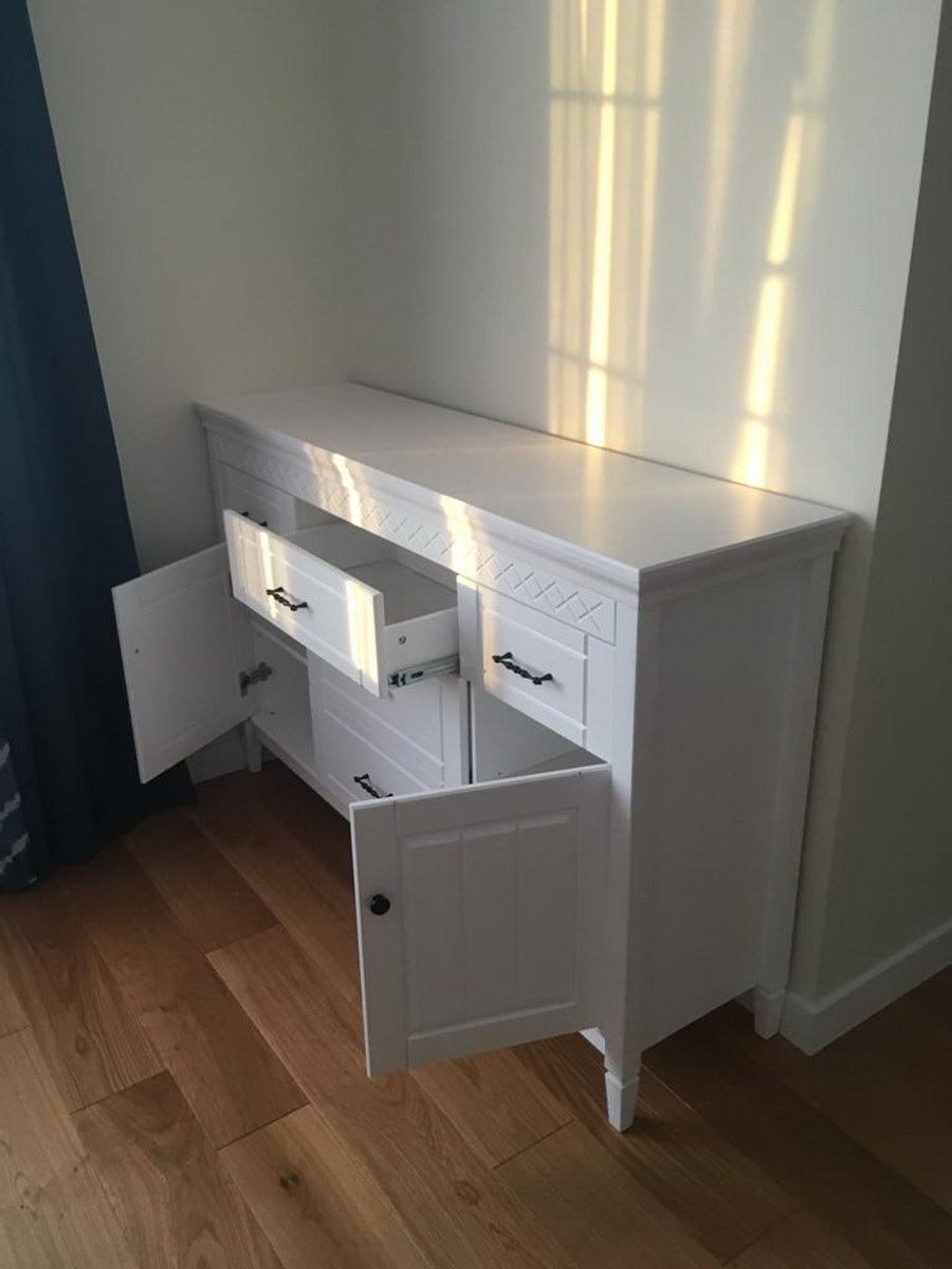 Материал - сосна, задняя стенка, дно ящиков - ДВП белого цвета.