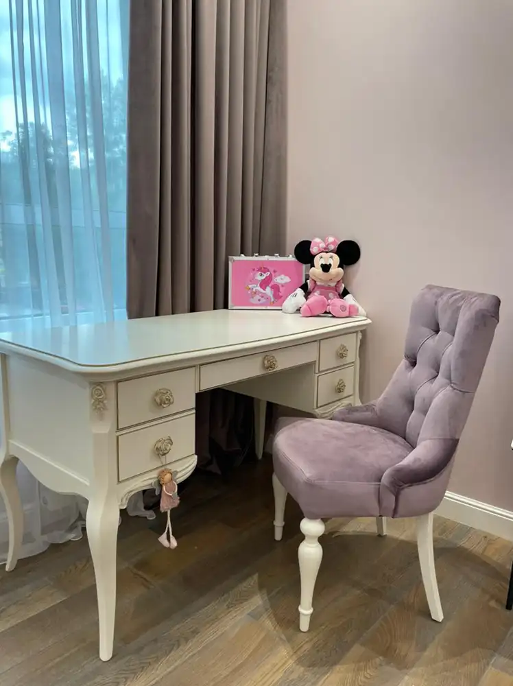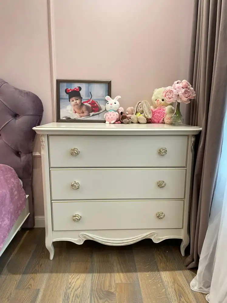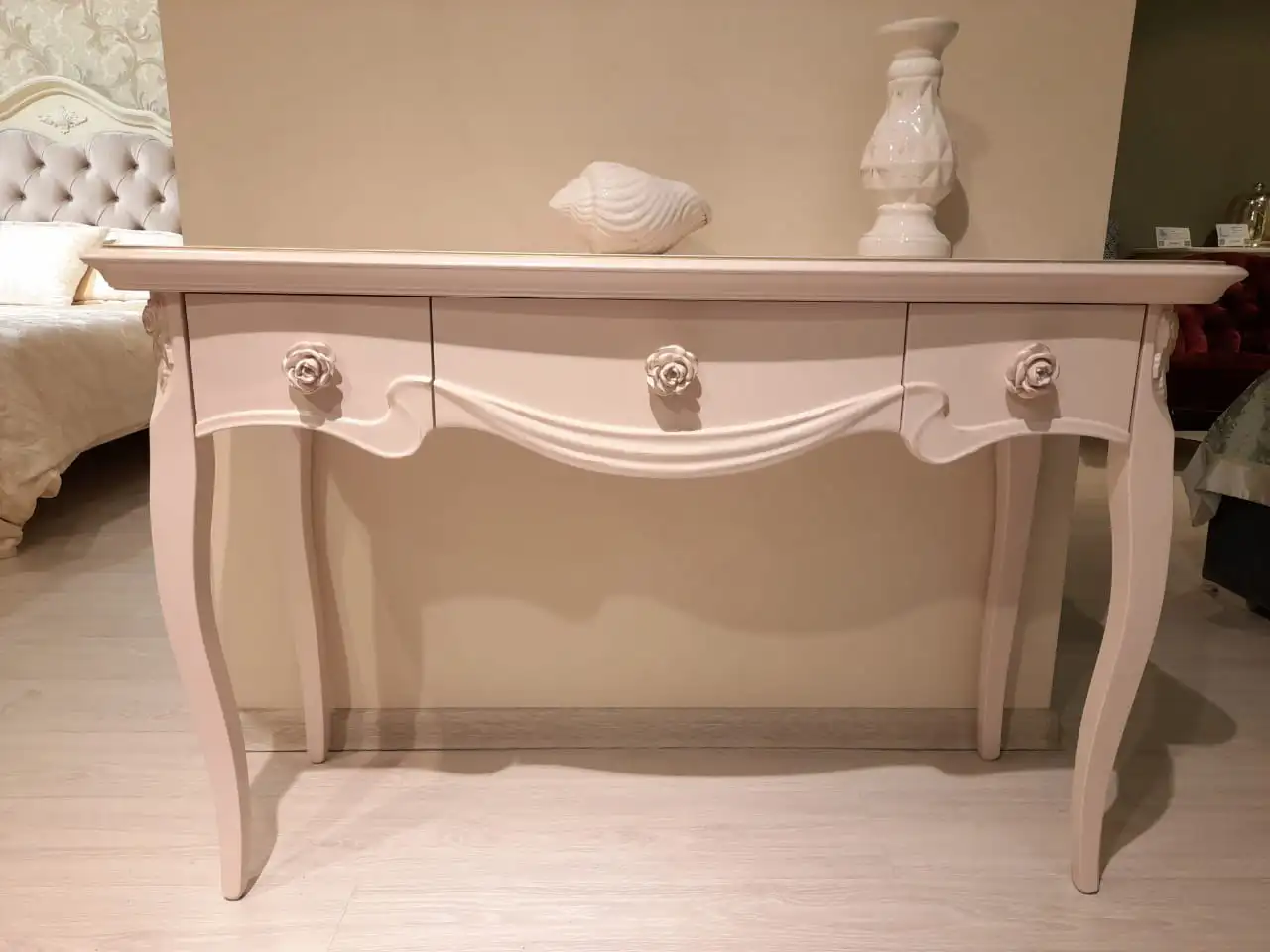 Коллекция мебели для спальни в цвете «слоновая кость с патиной». Возможна окраска в другие цвета: шоколад, розовая пудра, серо-бежевый, светло-бежевый, серо-коричневый, сланцево-серый, черный и т. д. В коллекцию входят прикроватные тумбы, шкафы для одежды, бельевые и обувные комоды, тумбы, консоли, серванты, библиотеки. Ручки и накладки на торцах сделаны в виде розовых бутонов.
