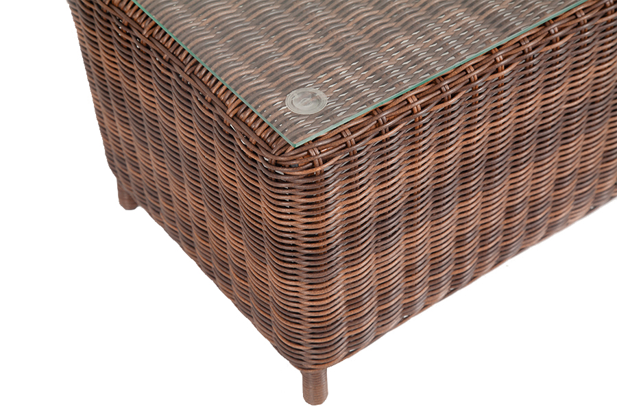 Журнальный столик "Копаннини" увеличивает функциональность зоны отдыха с креслами и диваном. Размер модели – 1000×500×420 мм. В основе мебели находится алюминиевый каркас высокой прочности. Декоративной составляющей является ручная круглая оплетка, которая выполнена из искусственного ротанга. Столик представлен в шоколадном цвете. В роли рабочей поверхности выступает столешница из закаленного стекла, которое отличается высокими эксплуатационными свойствами. Его толщина достигает 5 мм.