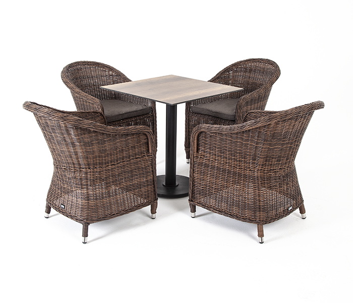 Обеденная группа «Ковачо» рассчитана на 4 персоны. В состав комплекта входит: - Стол "Ковачо" из HPL, размер столешницы - 70х70 см, цвет "дуб" - 4 плетеных кресла "Равенс" из искусственного ротанга, размером - 680×570×810 мм, цвет - коричневый. "Ковачо" интерьерный стол из HPL квадратный 70х70см, цвет "дуб" 1шт. 700Х700Х750, "Равенс" плетеное кресло из искусственного ротанга, цвет коричневый с серой подушкой 4шт. 570Х680Х810,