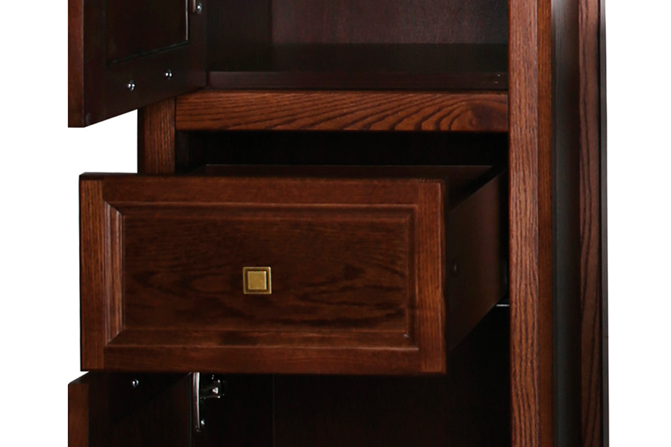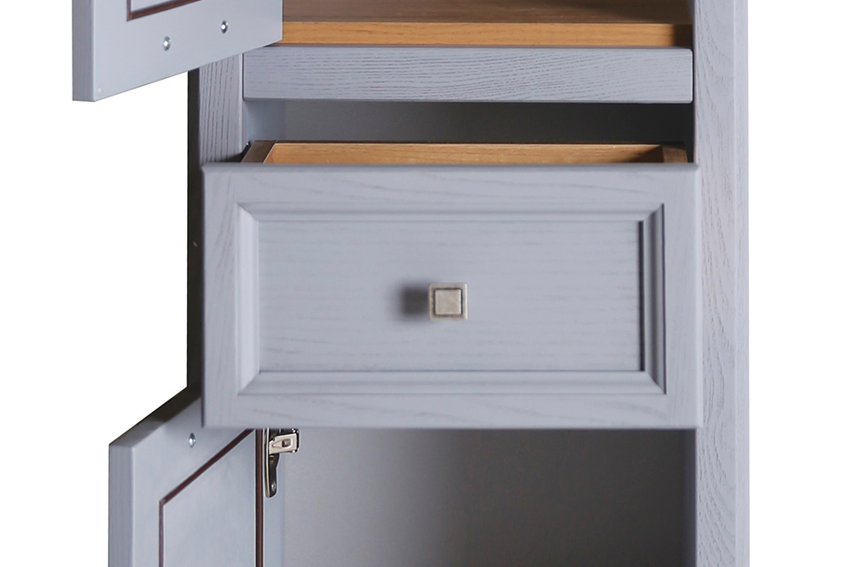 Мы предлагаем раковины и тумбы разного размера, шкафы с правым или левым расположением петель. Дверцы и ящики оснащены европейской фурнитурой, открываются и выдвигаются плавно, без хлопков. Корпуса и фасады сделаны из натурального дерева (массив ясеня) и покрыты матовым лаком. Стенки ящиков сделаны из МДФ. На ручки нанесено стойкое матовое покрытие с эффектом состаривания.