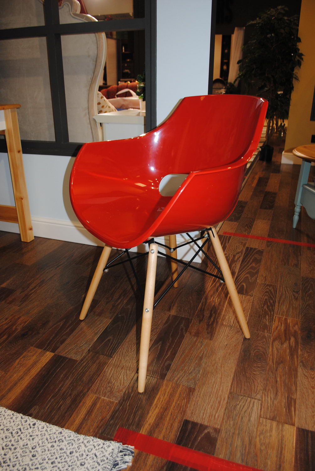 Продаем из зала яркий красный стул-кресло из пластика, ножки- натуральное дерево.