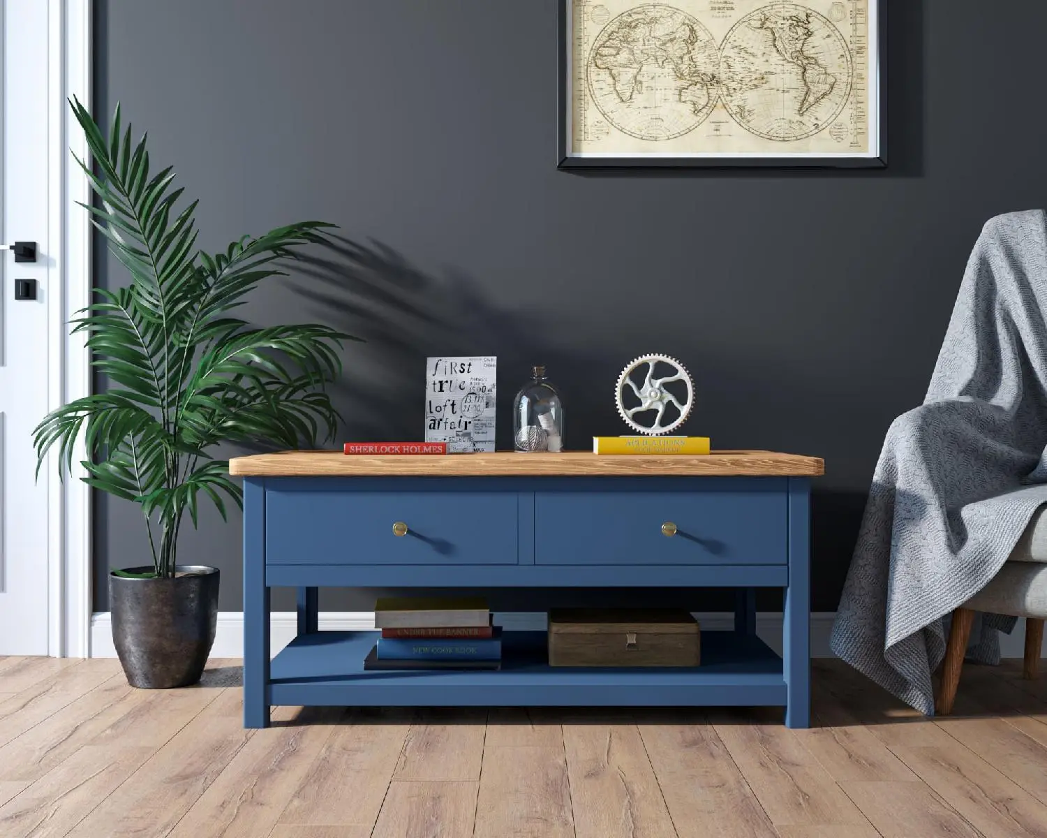 Наполнение: 2 выдвижных ящика, внизу открытая полка.